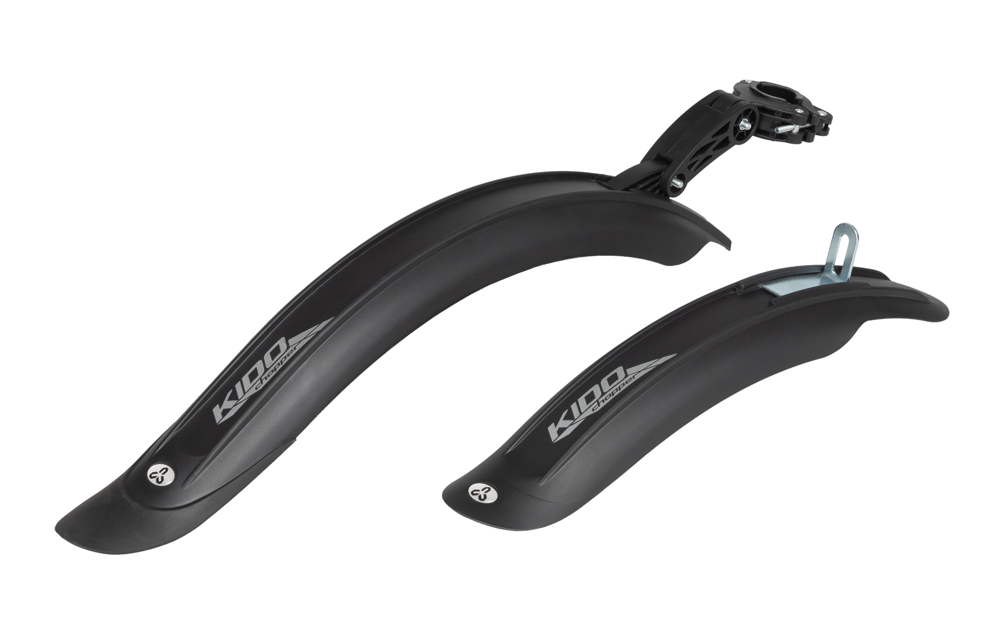 Kvalitné plastové blatníky určené pre 16'' bicykle; Jednoduché a rýchle upevnenie na bicykel; Váha: 265g; Rozmery: dĺžka/šírka Z - 43 cm/6,5 cm a dĺžka/šírka P - 33 cm /6,5 cm; Farba: čierna/čierna - reflexný nápis