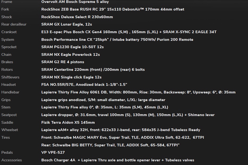 Jazdiť po horách a užívať si scenériu. Zjazdovať náročný downhill, a napriek tomu vnímať okolitú krajinu. To ponúka LAPIERRE Overvolt AM 7.7, vďaka ktorému prekonáte aj tie najvyššie hory a predefinujete svoje limity. Celoodpružený hliníkový rám s revolučným umiestnením ťažiska v strede bicykla a blízko zeme vám pomôže perfektne zvládnuť aj technicky najnáročnejšie chodníky. Výkonný pohon Bosch Performance line CX s batériou s neuveriteľnou kapacitou 750 Wh v kombinácii s komponentmi odpruženia Rock Shox, radením SRAM a špičkovými štvorpiestovými brzdami SRAM G2 RE sľubujú nenahraditeľný pôžitok z jazdy, o ktorom sa vám bude zdať každú noc. Samozrejmosťou je teleskopická sedlovka a plášte Schwalbe.