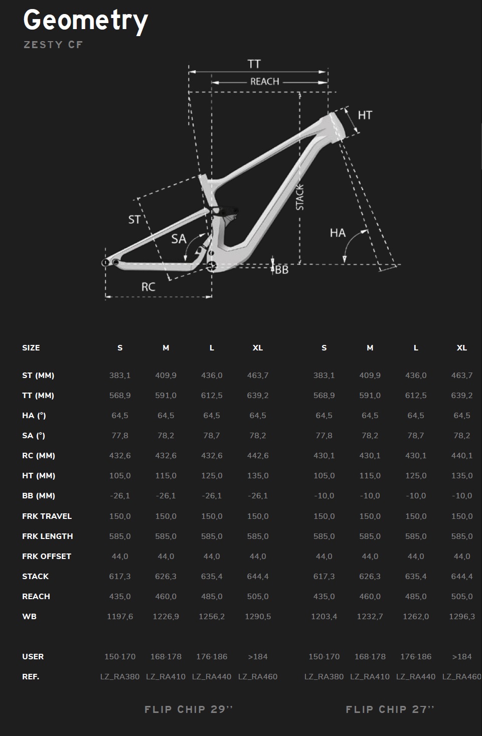 Nový Zesty CF je dizajnovaný tak, aby jazdcovi poskytol čo najväčšie sebavedomie a umožnil mu relaxovať aj v technicky náročných podmienkach a za plnej rýchlosti. Aby to dosiahol, jeho all-mountain geometria posunula pozíciu ťažiska späť na prednú časť bicykla a vybalansovala jeho stred. Vďaka tomu je šliapanie efektívnejšie na zvlnených úsekoch a znížilo sa riziko preklopenia sa na strmých svahoch. Vďaka technológii FlipChip je možné ešte viac zvýšiť responzivitu zadnej časti bicykla, a síce zmenou na 27,5“ zadné koleso. Bez straty výhod, ktoré geometria ponúka.