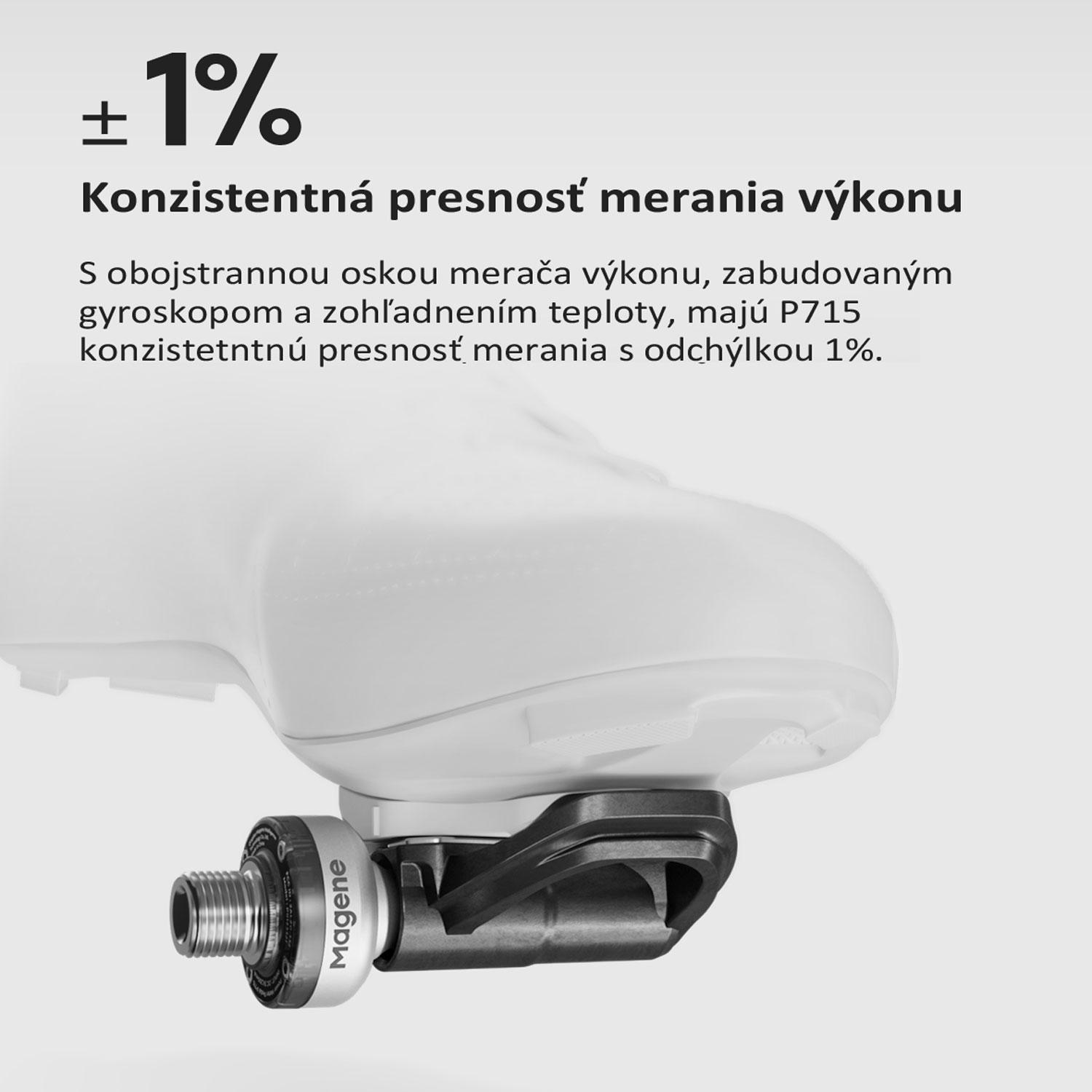 Vďaka integrovaným obojstranným meračom výkonu je senzor P715 umiestnený priamo tam, kde vaše nohy generujú silu. Minimalizuje tak straty a chyby pri prenose údajov. Pedále merajú výkon každej nohy zvlášť – v reálnom čase, s maximálnou presnosťou a bez kompromisov.