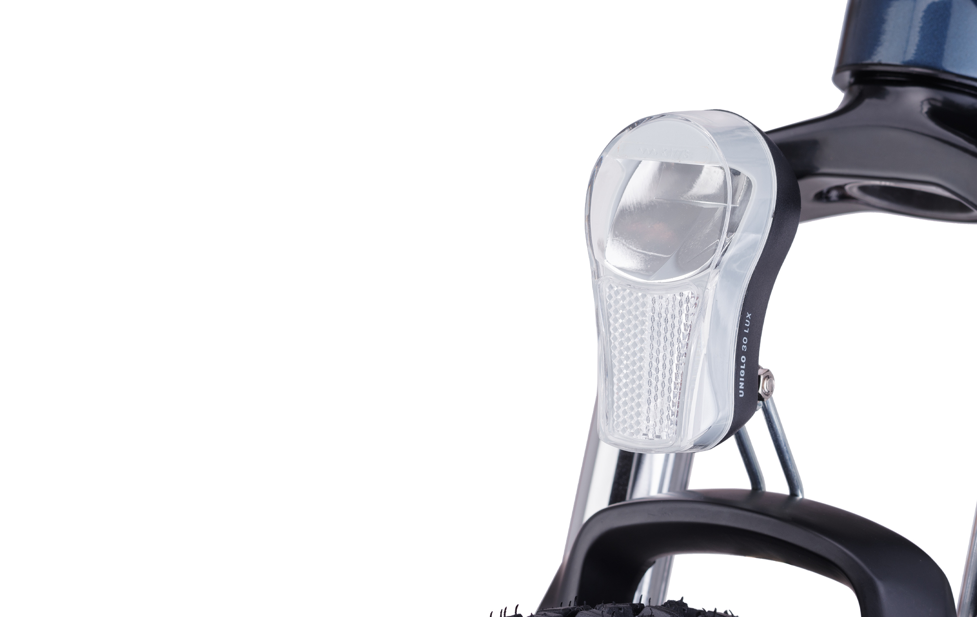 Predné osvetlenie s 1 výkonnou LED žiarovkou; Spĺňa normu StVZO; Funkcie: 100% - 50%; Vodoodolné konštrukcia; Upevnenie na vidlicu; Batérie: 2 x AA; Rozmer: 92x47x46 mm; Váha: 78g; Farba: strieborná